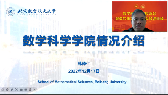 12月17日上午,数学科学学院举行校友会会员代表大会和第二届校友会理事会议。北航校友联络发展处处长张慧渊,数学科学学院院长韩德仁、党委书记袁星,数学科学学院校友代表共40人参加会议,会议由学院党委副书记曾煜主持。